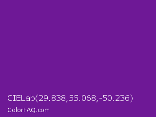 CIELab 29.838,55.068,-50.236 Color is a normal purple color and the nearest color is Seance #731e8f. Hex code #6e1896 and RGB value is rgb(110,24,150). In RGB color space, this color is composed of 43% red, 9% green, 59% blue, In CMYK color space, this color is composed of 27% cyan, 84% magenta, 0% yellow , 41% black , In HSL color space, this color has a hue angle of 281° , 72% saturation and 34% lightness.