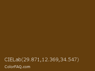 CIELab 29.871,12.369,34.547 Color is a very dark orange color and the nearest color is Pullman Brown UPS Brown #644117. Hex code #643e0d and RGB value is rgb(100,62,13). In RGB color space, this color is composed of 39% red, 24% green, 5% blue, In CMYK color space, this color is composed of 0% cyan, 38% magenta, 87% yellow , 61% black , In HSL color space, this color has a hue angle of 34° , 77% saturation and 22% lightness.