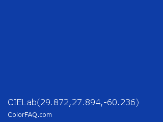 CIELab 29.872,27.894,-60.236 Color is a normal blue color and the nearest color is Egyptian Blue #1034a6. Hex code #0e3da6 and RGB value is rgb(14,61,166). In RGB color space, this color is composed of 5% red, 24% green, 65% blue, In CMYK color space, this color is composed of 92% cyan, 63% magenta, 0% yellow , 35% black , In HSL color space, this color has a hue angle of 221° , 84% saturation and 35% lightness.