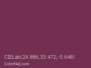 CIELab 29.886,33.472,-5.648 Color is a normal rose color and the nearest color is Finn #692d54. Hex code #722f50 and RGB value is rgb(114,47,80). In RGB color space, this color is composed of 45% red, 18% green, 31% blue, In CMYK color space, this color is composed of 0% cyan, 59% magenta, 30% yellow , 55% black , In HSL color space, this color has a hue angle of 330° , 42% saturation and 32% lightness.
