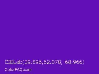 CIELab 29.896,62.078,-68.966 Color is a normal violet color and the nearest color is Purple Heart Crayola #652dc1. Hex code #6010b5 and RGB value is rgb(96,16,181). In RGB color space, this color is composed of 38% red, 6% green, 71% blue, In CMYK color space, this color is composed of 47% cyan, 91% magenta, 0% yellow , 29% black , In HSL color space, this color has a hue angle of 269° , 84% saturation and 39% lightness.