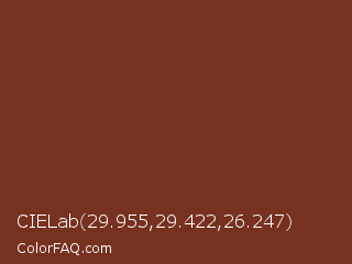 CIELab 29.955,29.422,26.247 Color is a dark red color and the nearest color is Mocha #782d19. Hex code #77311f and RGB value is rgb(119,49,31). In RGB color space, this color is composed of 47% red, 19% green, 12% blue, In CMYK color space, this color is composed of 0% cyan, 59% magenta, 74% yellow , 53% black , In HSL color space, this color has a hue angle of 12° , 59% saturation and 29% lightness.