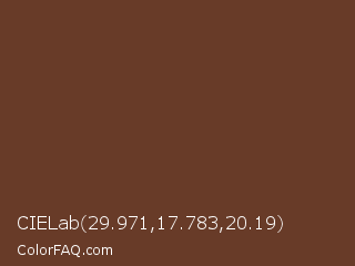 CIELab 29.971,17.783,20.19 Color is a dark orange color and the nearest color is Van Dyke Brown #664228. Hex code #683b28 and RGB value is rgb(104,59,40). In RGB color space, this color is composed of 41% red, 23% green, 16% blue, In CMYK color space, this color is composed of 0% cyan, 43% magenta, 62% yellow , 59% black , In HSL color space, this color has a hue angle of 18° , 44% saturation and 28% lightness.