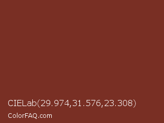 CIELab 29.974,31.576,23.308 Color is a normal red color and the nearest color is Red Robin #80341f. Hex code #792f24 and RGB value is rgb(121,47,36). In RGB color space, this color is composed of 47% red, 18% green, 14% blue, In CMYK color space, this color is composed of 0% cyan, 61% magenta, 70% yellow , 53% black , In HSL color space, this color has a hue angle of 8° , 54% saturation and 31% lightness.