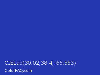 CIELab 30.02,38.4,-66.553 Color is a normal blue color and the nearest color is Governor Bay #2f3cb3. Hex code #2736b1 and RGB value is rgb(39,54,177). In RGB color space, this color is composed of 15% red, 21% green, 69% blue, In CMYK color space, this color is composed of 78% cyan, 69% magenta, 0% yellow , 31% black , In HSL color space, this color has a hue angle of 233° , 64% saturation and 42% lightness.