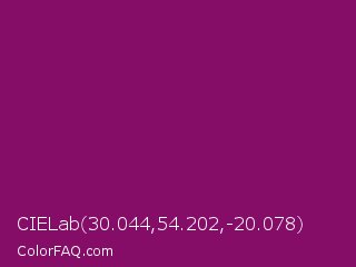 CIELab 30.044,54.202,-20.078 Color is a dark magenta color and the nearest color is Cardinal Pink #8c055e. Hex code #850d67 and RGB value is rgb(133,13,103). In RGB color space, this color is composed of 52% red, 5% green, 40% blue, In CMYK color space, this color is composed of 0% cyan, 90% magenta, 23% yellow , 48% black , In HSL color space, this color has a hue angle of 315° , 82% saturation and 29% lightness.