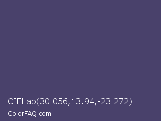CIELab 30.056,13.94,-23.272 Color is a normal indigo color and the nearest color is Mulled Wine #4e4562. Hex code #49416b and RGB value is rgb(73,65,107). In RGB color space, this color is composed of 29% red, 25% green, 42% blue, In CMYK color space, this color is composed of 32% cyan, 39% magenta, 0% yellow , 58% black , In HSL color space, this color has a hue angle of 251° , 24% saturation and 34% lightness.