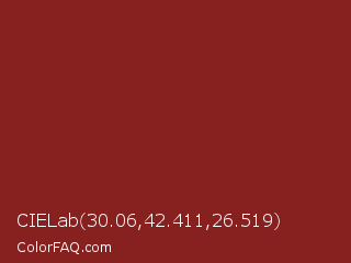CIELab 30.06,42.411,26.519 Color is a normal red color and the nearest color is Merlot #831923. Hex code #862120 and RGB value is rgb(134,33,32). In RGB color space, this color is composed of 53% red, 13% green, 13% blue, In CMYK color space, this color is composed of 0% cyan, 75% magenta, 76% yellow , 47% black , In HSL color space, this color has a hue angle of 1° , 61% saturation and 33% lightness.