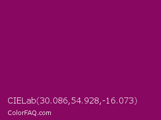 CIELab 30.086,54.928,-16.073 Color is a dark magenta color and the nearest color is Cardinal Pink #8c055e. Hex code #880861 and RGB value is rgb(136,8,97). In RGB color space, this color is composed of 53% red, 3% green, 38% blue, In CMYK color space, this color is composed of 0% cyan, 94% magenta, 29% yellow , 47% black , In HSL color space, this color has a hue angle of 318° , 89% saturation and 28% lightness.