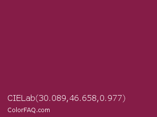 CIELab 30.089,46.658,0.977 Color is a normal rose color and the nearest color is Disco #871550. Hex code #851c47 and RGB value is rgb(133,28,71). In RGB color space, this color is composed of 52% red, 11% green, 28% blue, In CMYK color space, this color is composed of 0% cyan, 79% magenta, 47% yellow , 48% black , In HSL color space, this color has a hue angle of 335° , 65% saturation and 32% lightness.