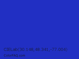 CIELab 30.148,48.341,-77.004 Color is a normal blue color and the nearest color is Persian Blue #1c39bb. Hex code #212fc3 and RGB value is rgb(33,47,195). In RGB color space, this color is composed of 13% red, 18% green, 76% blue, In CMYK color space, this color is composed of 83% cyan, 76% magenta, 0% yellow , 24% black , In HSL color space, this color has a hue angle of 235° , 71% saturation and 45% lightness.