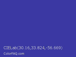 CIELab 30.16,33.824,-56.669 Color is a normal indigo color and the nearest color is Blue Pigment #333399. Hex code #3a38a1 and RGB value is rgb(58,56,161). In RGB color space, this color is composed of 23% red, 22% green, 63% blue, In CMYK color space, this color is composed of 64% cyan, 65% magenta, 0% yellow , 37% black , In HSL color space, this color has a hue angle of 241° , 48% saturation and 43% lightness.