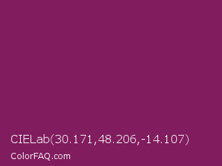 CIELab 30.171,48.206,-14.107 Color is a normal magenta color and the nearest color is French Plum #811453. Hex code #811c5e and RGB value is rgb(129,28,94). In RGB color space, this color is composed of 51% red, 11% green, 37% blue, In CMYK color space, this color is composed of 0% cyan, 78% magenta, 27% yellow , 49% black , In HSL color space, this color has a hue angle of 321° , 64% saturation and 31% lightness.