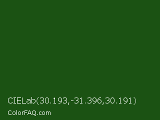 CIELab 30.193,-31.396,30.191 Color is a very dark green color and the nearest color is Green House #24500f. Hex code #1b5213 and RGB value is rgb(27,82,19). In RGB color space, this color is composed of 11% red, 32% green, 7% blue, In CMYK color space, this color is composed of 67% cyan, 0% magenta, 77% yellow , 68% black , In HSL color space, this color has a hue angle of 112° , 62% saturation and 20% lightness.
