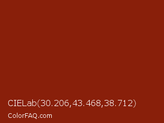 CIELab 30.206,43.468,38.712 Color is a dark red color and the nearest color is Smokey Topaz #832a0d. Hex code #891f0a and RGB value is rgb(137,31,10). In RGB color space, this color is composed of 54% red, 12% green, 4% blue, In CMYK color space, this color is composed of 0% cyan, 77% magenta, 93% yellow , 46% black , In HSL color space, this color has a hue angle of 10° , 86% saturation and 29% lightness.