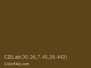 CIELab 30.26,7.45,29.443 Color is a dark orange color and the nearest color is Pullman Brown UPS Brown #644117. Hex code #5e4218 and RGB value is rgb(94,66,24). In RGB color space, this color is composed of 37% red, 26% green, 9% blue, In CMYK color space, this color is composed of 0% cyan, 30% magenta, 74% yellow , 63% black , In HSL color space, this color has a hue angle of 36° , 59% saturation and 23% lightness.