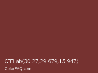 CIELab 30.27,29.679,15.947 Color is a normal red color and the nearest color is Wine #722f37. Hex code #763230 and RGB value is rgb(118,50,48). In RGB color space, this color is composed of 46% red, 20% green, 19% blue, In CMYK color space, this color is composed of 0% cyan, 58% magenta, 59% yellow , 54% black , In HSL color space, this color has a hue angle of 2° , 42% saturation and 33% lightness.
