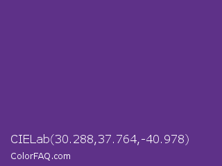 CIELab 30.288,37.764,-40.978 Color is a normal purple color and the nearest color is Blue Magenta Violet #553592. Hex code #5e3188 and RGB value is rgb(94,49,136). In RGB color space, this color is composed of 37% red, 19% green, 53% blue, In CMYK color space, this color is composed of 31% cyan, 64% magenta, 0% yellow , 47% black , In HSL color space, this color has a hue angle of 271° , 47% saturation and 36% lightness.