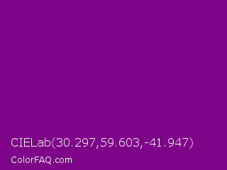 CIELab 30.297,59.603,-41.947 Color is a dark magenta color and the nearest color is Patriarch #800080. Hex code #7e048a and RGB value is rgb(126,4,138). In RGB color space, this color is composed of 49% red, 2% green, 54% blue, In CMYK color space, this color is composed of 9% cyan, 97% magenta, 0% yellow , 46% black , In HSL color space, this color has a hue angle of 295° , 94% saturation and 28% lightness.