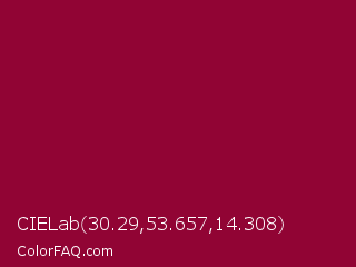 CIELab 30.29,53.657,14.308 Color is a dark rose color and the nearest color is Pink Raspberry #980036. Hex code #910434 and RGB value is rgb(145,4,52). In RGB color space, this color is composed of 57% red, 2% green, 20% blue, In CMYK color space, this color is composed of 0% cyan, 97% magenta, 64% yellow , 43% black , In HSL color space, this color has a hue angle of 340° , 95% saturation and 29% lightness.