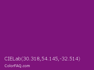 CIELab 30.318,54.145,-32.514 Color is a dark magenta color and the nearest color is Patriarch #800080. Hex code #7e147b and RGB value is rgb(126,20,123). In RGB color space, this color is composed of 49% red, 8% green, 48% blue, In CMYK color space, this color is composed of 0% cyan, 84% magenta, 2% yellow , 51% black , In HSL color space, this color has a hue angle of 302° , 73% saturation and 29% lightness.