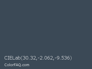 CIELab 30.32,-2.062,-9.536 Color is a dark blue color and the nearest color is Oxford Blue #384555. Hex code #3b4956 and RGB value is rgb(59,73,86). In RGB color space, this color is composed of 23% red, 29% green, 34% blue, In CMYK color space, this color is composed of 31% cyan, 15% magenta, 0% yellow , 66% black , In HSL color space, this color has a hue angle of 209° , 19% saturation and 28% lightness.