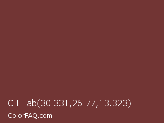 CIELab 30.331,26.77,13.323 Color is a normal red color and the nearest color is Wine #722f37. Hex code #723534 and RGB value is rgb(114,53,52). In RGB color space, this color is composed of 45% red, 21% green, 20% blue, In CMYK color space, this color is composed of 0% cyan, 54% magenta, 54% yellow , 55% black , In HSL color space, this color has a hue angle of 1° , 37% saturation and 33% lightness.