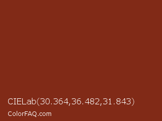 CIELab 30.364,36.482,31.843 Color is a dark red color and the nearest color is Pueblo #7d2c14. Hex code #812a17 and RGB value is rgb(129,42,23). In RGB color space, this color is composed of 51% red, 16% green, 9% blue, In CMYK color space, this color is composed of 0% cyan, 67% magenta, 82% yellow , 49% black , In HSL color space, this color has a hue angle of 11° , 70% saturation and 30% lightness.