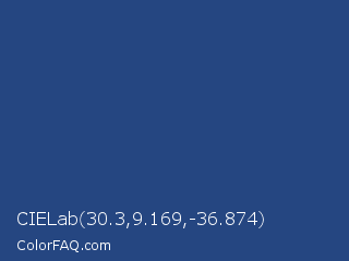 CIELab 30.3,9.169,-36.874 Color is a normal blue color and the nearest color is Bay Of Many #273a81. Hex code #254681 and RGB value is rgb(37,70,129). In RGB color space, this color is composed of 15% red, 27% green, 51% blue, In CMYK color space, this color is composed of 71% cyan, 46% magenta, 0% yellow , 49% black , In HSL color space, this color has a hue angle of 218° , 55% saturation and 33% lightness.