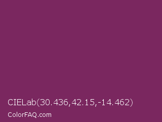 CIELab 30.436,42.15,-14.462 Color is a normal magenta color and the nearest color is Byzantium #702963. Hex code #7a275f and RGB value is rgb(122,39,95). In RGB color space, this color is composed of 48% red, 15% green, 37% blue, In CMYK color space, this color is composed of 0% cyan, 68% magenta, 22% yellow , 52% black , In HSL color space, this color has a hue angle of 320° , 52% saturation and 32% lightness.
