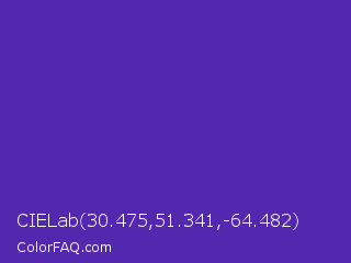 CIELab 30.475,51.341,-64.482 Color is a normal indigo color and the nearest color is Daisy Bush #4f2398. Hex code #5427af and RGB value is rgb(84,39,175). In RGB color space, this color is composed of 33% red, 15% green, 69% blue, In CMYK color space, this color is composed of 52% cyan, 78% magenta, 0% yellow , 31% black , In HSL color space, this color has a hue angle of 260° , 64% saturation and 42% lightness.