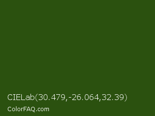CIELab 30.479,-26.064,32.39 Color is a very dark green color and the nearest color is Green House #24500f. Hex code #2b510f and RGB value is rgb(43,81,15). In RGB color space, this color is composed of 17% red, 32% green, 6% blue, In CMYK color space, this color is composed of 47% cyan, 0% magenta, 81% yellow , 68% black , In HSL color space, this color has a hue angle of 95° , 69% saturation and 19% lightness.