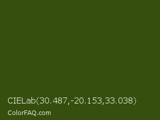 CIELab 30.487,-20.153,33.038 Color is a very dark green color and the nearest color is Clover #384910. Hex code #374f0e and RGB value is rgb(55,79,14). In RGB color space, this color is composed of 22% red, 31% green, 5% blue, In CMYK color space, this color is composed of 30% cyan, 0% magenta, 82% yellow , 69% black , In HSL color space, this color has a hue angle of 82° , 70% saturation and 18% lightness.