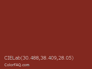 CIELab 30.488,38.409,28.05 Color is a normal red color and the nearest color is Kobe #882d17. Hex code #83281e and RGB value is rgb(131,40,30). In RGB color space, this color is composed of 51% red, 16% green, 12% blue, In CMYK color space, this color is composed of 0% cyan, 69% magenta, 77% yellow , 49% black , In HSL color space, this color has a hue angle of 6° , 63% saturation and 32% lightness.