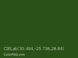 CIELab 30.494,-25.738,28.84 Color is a very dark green color and the nearest color is Green House #24500f. Hex code #2a5117 and RGB value is rgb(42,81,23). In RGB color space, this color is composed of 16% red, 32% green, 9% blue, In CMYK color space, this color is composed of 48% cyan, 0% magenta, 72% yellow , 68% black , In HSL color space, this color has a hue angle of 100° , 56% saturation and 20% lightness.