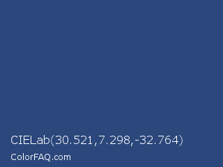 CIELab 30.521,7.298,-32.764 Color is a normal blue color and the nearest color is Astronaut #283a77. Hex code #2b477b and RGB value is rgb(43,71,123). In RGB color space, this color is composed of 17% red, 28% green, 48% blue, In CMYK color space, this color is composed of 65% cyan, 42% magenta, 0% yellow , 52% black , In HSL color space, this color has a hue angle of 219° , 48% saturation and 33% lightness.