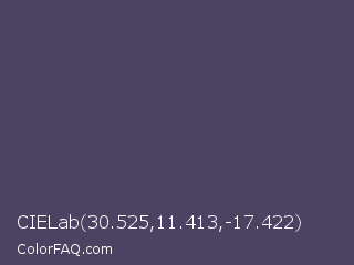 CIELab 30.525,11.413,-17.422 Color is a normal indigo color and the nearest color is Mulled Wine #4e4562. Hex code #4c4363 and RGB value is rgb(76,67,99). In RGB color space, this color is composed of 30% red, 26% green, 39% blue, In CMYK color space, this color is composed of 23% cyan, 32% magenta, 0% yellow , 61% black , In HSL color space, this color has a hue angle of 257° , 19% saturation and 33% lightness.