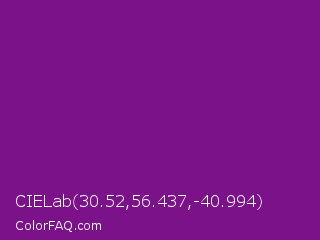 CIELab 30.52,56.437,-40.994 Color is a dark magenta color and the nearest color is Seance #731e8f. Hex code #7b1289 and RGB value is rgb(123,18,137). In RGB color space, this color is composed of 48% red, 7% green, 54% blue, In CMYK color space, this color is composed of 10% cyan, 87% magenta, 0% yellow , 46% black , In HSL color space, this color has a hue angle of 293° , 77% saturation and 30% lightness.