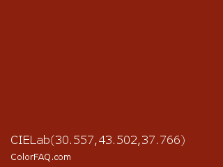 CIELab 30.557,43.502,37.766 Color is a dark red color and the nearest color is Smokey Topaz #832a0d. Hex code #8a200d and RGB value is rgb(138,32,13). In RGB color space, this color is composed of 54% red, 13% green, 5% blue, In CMYK color space, this color is composed of 0% cyan, 77% magenta, 91% yellow , 46% black , In HSL color space, this color has a hue angle of 9° , 83% saturation and 30% lightness.