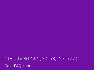 CIELab 30.561,60.53,-57.577 Color is a normal purple color and the nearest color is Purple #660099. Hex code #700fa4 and RGB value is rgb(112,15,164). In RGB color space, this color is composed of 44% red, 6% green, 64% blue, In CMYK color space, this color is composed of 32% cyan, 91% magenta, 0% yellow , 36% black , In HSL color space, this color has a hue angle of 279° , 83% saturation and 35% lightness.