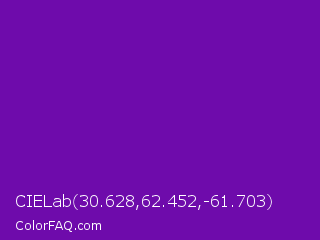 CIELab 30.628,62.452,-61.703 Color is a normal purple color and the nearest color is Purple #660099. Hex code #6e0bab and RGB value is rgb(110,11,171). In RGB color space, this color is composed of 43% red, 4% green, 67% blue, In CMYK color space, this color is composed of 36% cyan, 94% magenta, 0% yellow , 33% black , In HSL color space, this color has a hue angle of 277° , 88% saturation and 36% lightness.