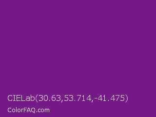 CIELab 30.63,53.714,-41.475 Color is a normal purple color and the nearest color is Seance #731e8f. Hex code #771a8a and RGB value is rgb(119,26,138). In RGB color space, this color is composed of 47% red, 10% green, 54% blue, In CMYK color space, this color is composed of 14% cyan, 81% magenta, 0% yellow , 46% black , In HSL color space, this color has a hue angle of 290° , 68% saturation and 32% lightness.