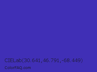 CIELab 30.641,46.791,-68.449 Color is a normal indigo color and the nearest color is Governor Bay #2f3cb3. Hex code #402fb6 and RGB value is rgb(64,47,182). In RGB color space, this color is composed of 25% red, 18% green, 71% blue, In CMYK color space, this color is composed of 65% cyan, 74% magenta, 0% yellow , 29% black , In HSL color space, this color has a hue angle of 248° , 59% saturation and 45% lightness.