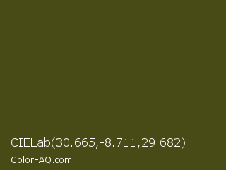 CIELab 30.665,-8.711,29.682 Color is a very dark yellow color and the nearest color is Army Green #4b5320. Hex code #494b17 and RGB value is rgb(73,75,23). In RGB color space, this color is composed of 29% red, 29% green, 9% blue, In CMYK color space, this color is composed of 3% cyan, 0% magenta, 69% yellow , 71% black , In HSL color space, this color has a hue angle of 62° , 53% saturation and 19% lightness.