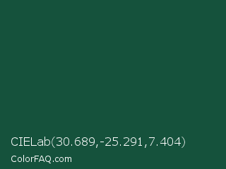 CIELab 30.689,-25.291,7.404 Color is a very dark green color and the nearest color is Brunswick Green #1b4d3e. Hex code #15523c and RGB value is rgb(21,82,60). In RGB color space, this color is composed of 8% red, 32% green, 24% blue, In CMYK color space, this color is composed of 74% cyan, 0% magenta, 27% yellow , 68% black , In HSL color space, this color has a hue angle of 158° , 59% saturation and 20% lightness.