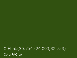 CIELab 30.754,-24.093,32.753 Color is a very dark green color and the nearest color is Clover #384910. Hex code #30510f and RGB value is rgb(48,81,15). In RGB color space, this color is composed of 19% red, 32% green, 6% blue, In CMYK color space, this color is composed of 41% cyan, 0% magenta, 81% yellow , 68% black , In HSL color space, this color has a hue angle of 90° , 69% saturation and 19% lightness.