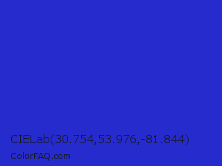 CIELab 30.754,53.976,-81.844 Color is a normal blue color and the nearest color is Persian Blue #1c39bb. Hex code #262bcd and RGB value is rgb(38,43,205). In RGB color space, this color is composed of 15% red, 17% green, 80% blue, In CMYK color space, this color is composed of 81% cyan, 79% magenta, 0% yellow , 20% black , In HSL color space, this color has a hue angle of 238° , 69% saturation and 48% lightness.