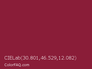 CIELab 30.801,46.529,12.082 Color is a normal red color and the nearest color is Antique Ruby #841b2d. Hex code #8a1d38 and RGB value is rgb(138,29,56). In RGB color space, this color is composed of 54% red, 11% green, 22% blue, In CMYK color space, this color is composed of 0% cyan, 79% magenta, 59% yellow , 46% black , In HSL color space, this color has a hue angle of 345° , 65% saturation and 33% lightness.