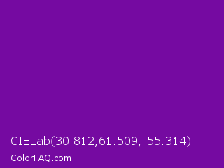 CIELab 30.812,61.509,-55.314 Color is a normal purple color and the nearest color is Purple #660099. Hex code #750aa1 and RGB value is rgb(117,10,161). In RGB color space, this color is composed of 46% red, 4% green, 63% blue, In CMYK color space, this color is composed of 27% cyan, 94% magenta, 0% yellow , 37% black , In HSL color space, this color has a hue angle of 283° , 88% saturation and 34% lightness.