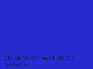CIELab 30.825,54.24,-82.31 Color is a normal blue color and the nearest color is Persian Blue #1c39bb. Hex code #252bce and RGB value is rgb(37,43,206). In RGB color space, this color is composed of 15% red, 17% green, 81% blue, In CMYK color space, this color is composed of 82% cyan, 79% magenta, 0% yellow , 19% black , In HSL color space, this color has a hue angle of 238° , 70% saturation and 48% lightness.
